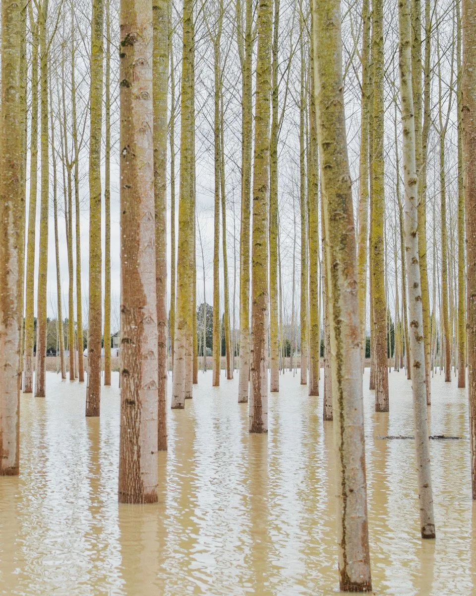 Wednesday brought fallen trees, flooded fields and no electricity for days. I took my camera (and Edie) to see the poplars near Montesquieu. The fields had become lakes, as trees stood in water that shouldn’t be there, creating these scenes of line and light….